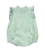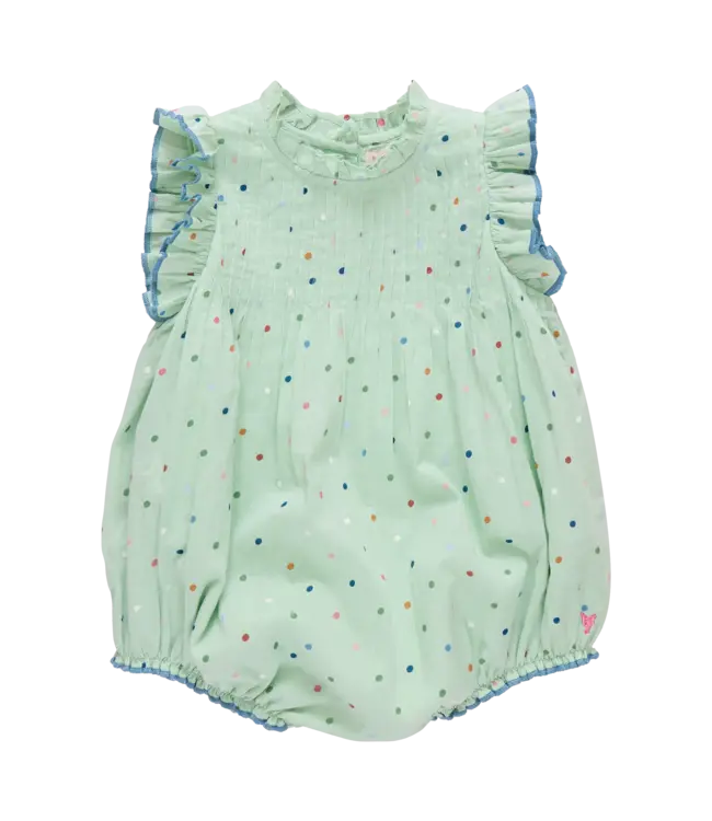 Crafted in soft 100% cotton voile and features a pastel green polka dot print. Designed with silver glitter buttons, blue pearl stitch accents, and ring snap closures for easy diaper changes, this lightweight bubble is perfect for everyday spring dressing