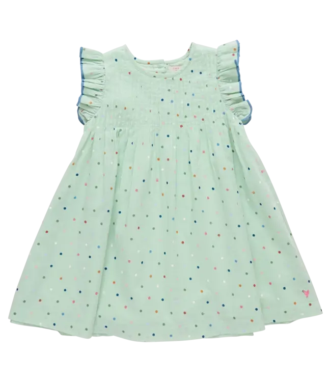 A smocked chest creates a comfortable, flexible fit, while ruffle sleeves and blue pearl stitching add thoughtful finishing touches. Silver glitter buttons bring shine, and the pastel green polka dot print keeps the look fresh and spring-ready.