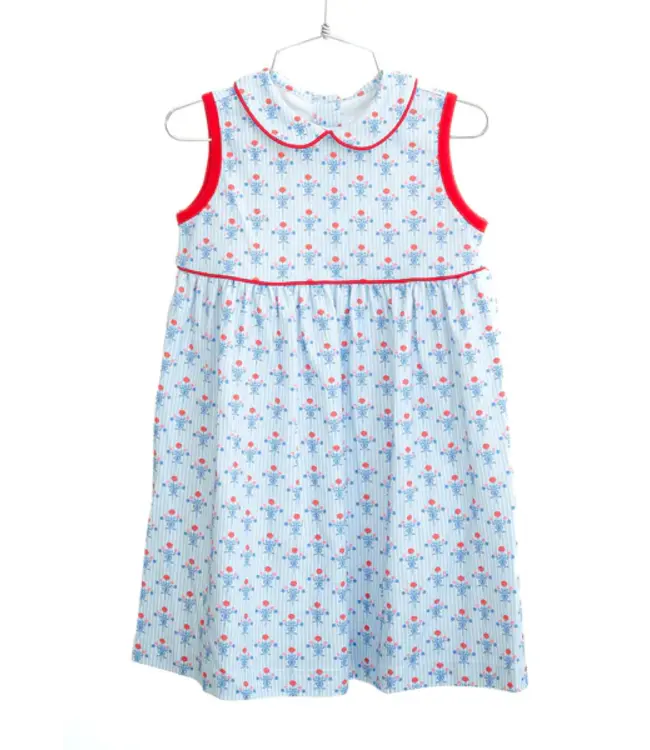 Ruth and Ralph's Pima Patriotic Floral Dress is a classic summer option for little girls. Made from 100% Pima cotton, this soft dress features a red and blue floral pattern with red details.