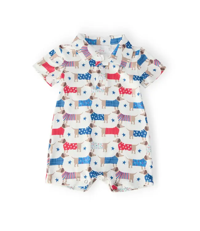 Mila & Rose's super soft Patriotic Pups Polo Shorty one-piece is perfect for your baby boy this summer! Featuring an adorable red, white & blue dog print and button snap closure for easy diaper changes.