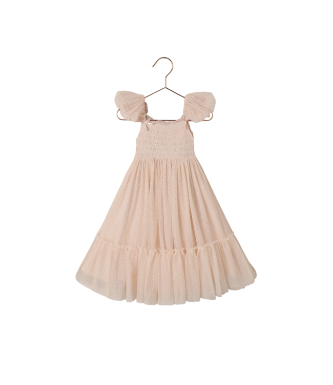 Noralee's Clara Dress, made from swiss dot tulle, features a smocked bodice with bow detail, and a full tiered skirt. Featuring Noralee's ‘pearl’ hue.