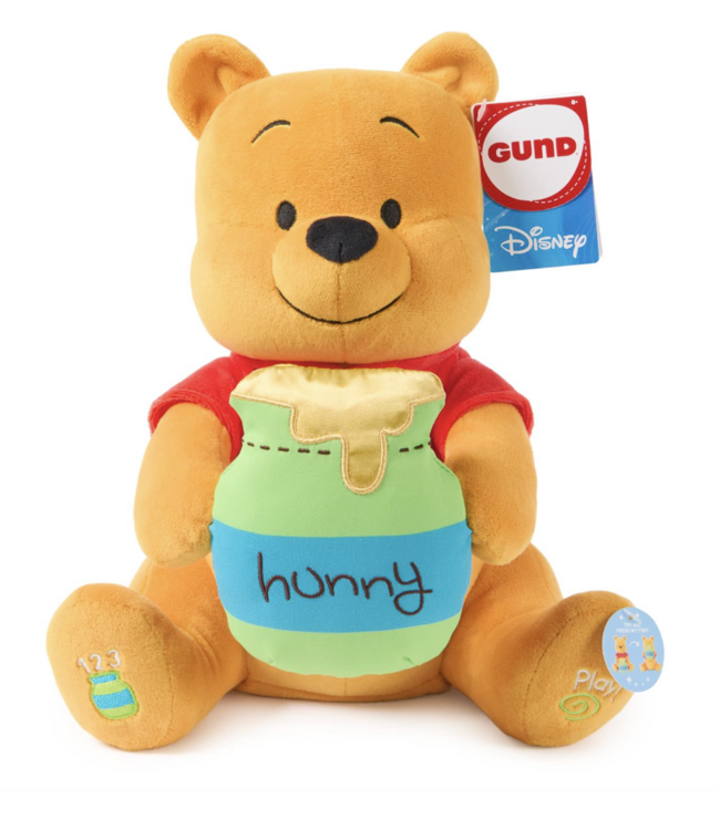 Pooh Bear has a rumbly in his tumbly! Disney's Winnie the Pooh is joining the play date to teach your little one how to count and play peek-a-boo! This soft, stuffed 11-inch bear features the iconic bear, looking as cuddly and adorable as ever, with a huggable body, soft amber plush, and a velvety red t-shirt. Pooh holds a bright green honeypot in his hands, which has a splash of gold embroidered honey for extra tactile fun. Using the switch on his bottom, parents can wake Pooh Bear up to begin an interactive peek-a-boo game or teach babies to count to three as he counts sips of honey! Pooh raises and lowers his arms as he clutches the honeypot playfully to hide his face. This innovative plush features over 20 whimsical phrases to provide exciting, unique playdates and includes volume controls for a safe, comfortable, and customized play session each time.