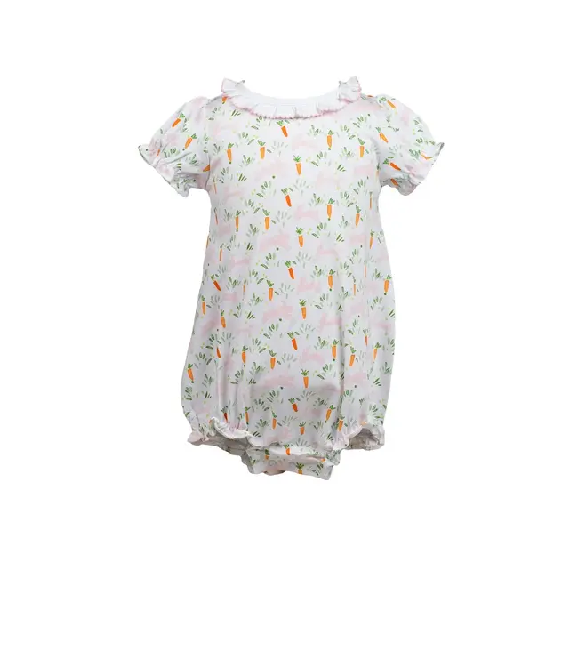 Sweet and joyful, The Proper Peony Peeps Girl Bubble features soft bunnies and carrots on luxurious Peruvian Pima cotton. Designed with snaps for easy changes and perfect for Easter, with coordinating sibling styles available.