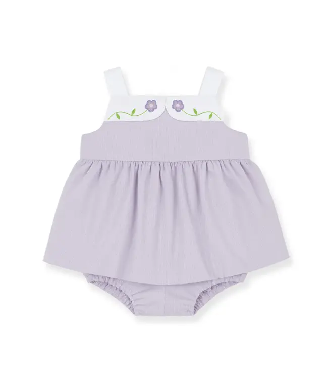 Soft and sweet for springtime days, this romper from Florence Eiseman is crafted from lavender and white pincord with a crisp white finewale piqué accent for a polished finish. Appliqué flowers and leaves add delicate charm, creating a look that feels both playful and special for the season.