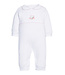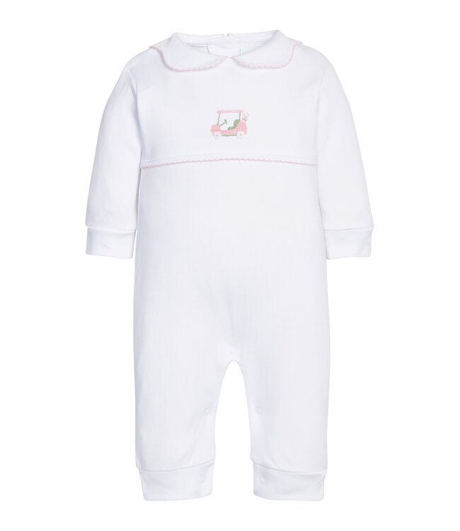 Little English's Crochet Playsuit is made from 100% Pima cotton with a hand-crocheted golf cart, light pink picot trim, and a scalloped peter pan collar for your baby girl to cozy up in. The ideal gift for golf-loving parents!