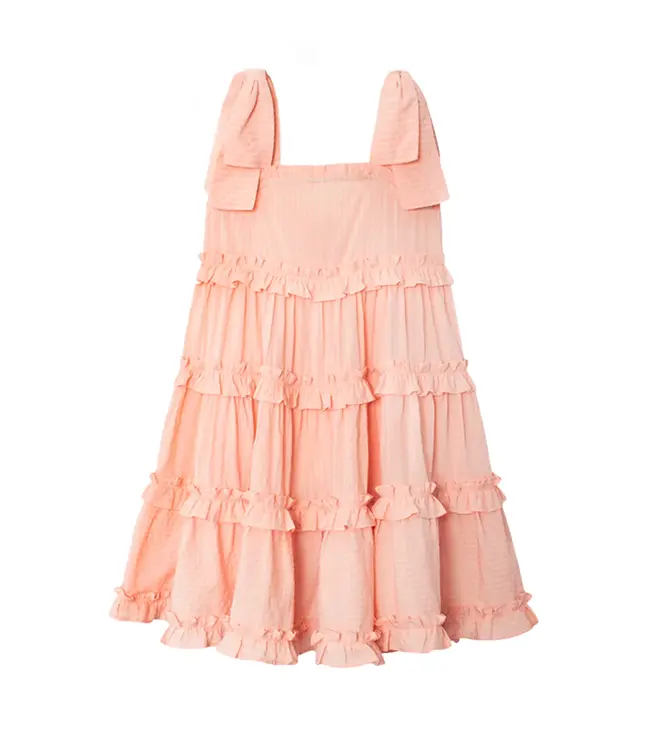 This light peach dress features wide shoulder straps with fixed bow detail and a tiered skirt with cascading ruffles for added texture and movement. The fitted bodice transitions into an A-line flowing silhouette, creating a playful and airy design.