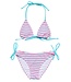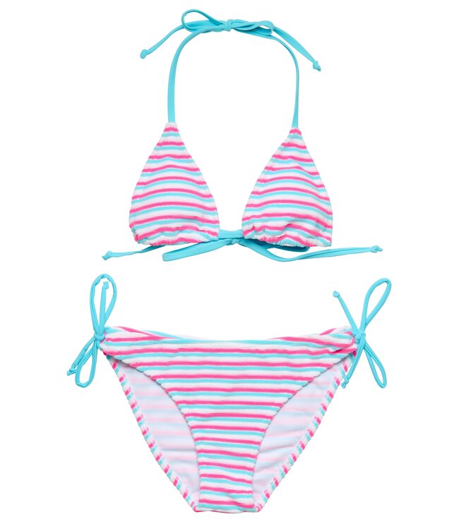 The Sorbet Stripe Triangle Bikini brings the wow with plush velvet-touch fabric and bold sorbet-colored stripes in pink, aqua, and white. Features adjustable neck and back ties, with thin removable padding in sizes 12–16. Fully lined for all-day comfort.