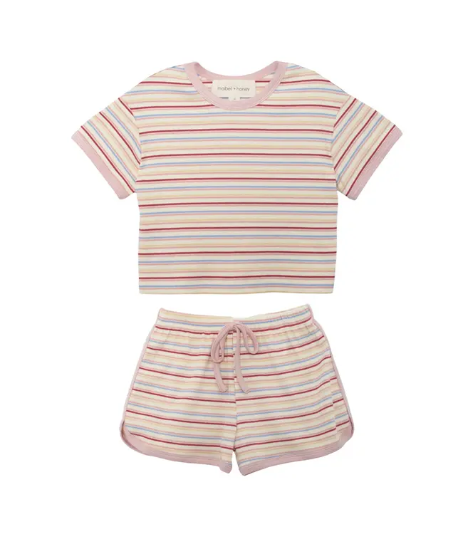 Brighten up her days with this colorful and comfortable set! Crafted from soft, stretchy ribbed knit, this two-piece set is designed to move with her during playtime. It features playful multi-color horizontal stripes, accented by delicate light pink trim