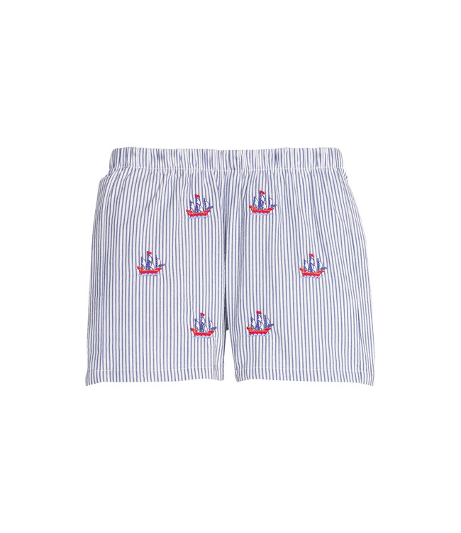 Adventure awaits with Little English's pirates collection! This Embroidered Basic Short features royal blue stripe seersucker with all-over pirate ship embroidery. Pair it with a classic Little English Short Sleeve Polo for a look he will treasure.