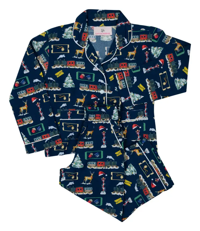 The Polar Express Pajama Set brings the magic of Christmas Eve to bedtime with a nostalgic train-themed print. Featuring a classic button-up top with white piping and soft, breathable fabric, it's perfect for snuggling up with hot cocoa and a holiday tale