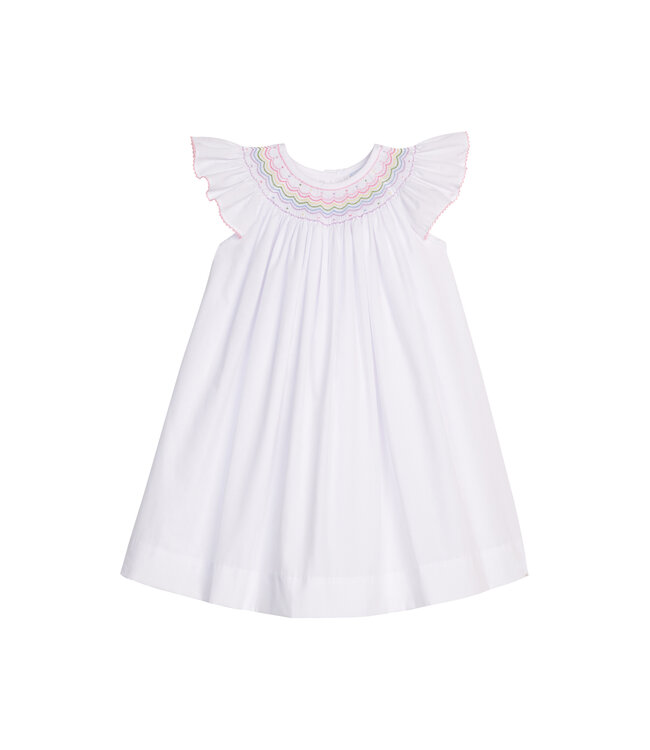 Brighten any day with Little English's Smocked Bishop Dress, a timeless silhouette for girls with rainbow hand-smocking and light pink ric-rac. Perfect for birthdays, Easter, and every joyful occasion in between, this happy dress is sure to be a favorite!