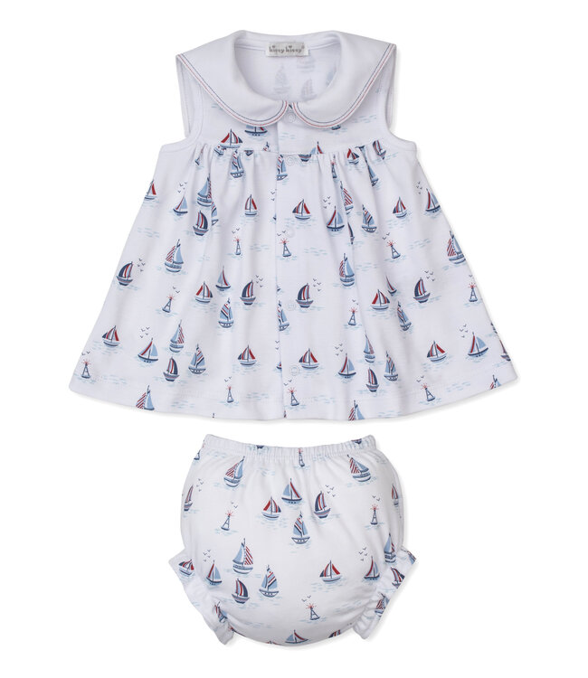 Kissy Kissy's fun red, white, & blue regatta print patterns this baby girls' dress set, complete with a diaper cover. Made from 100% Pima cotton for a soft and comfortable fit.