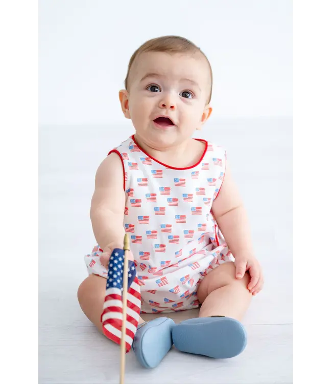 Ruth and Ralph's Pima American Flag Bubble is a classic one-piece for baby boys. Made from 100% Pima cotton, it’s soft, lightweight, and comfortable for everyday wear.