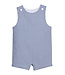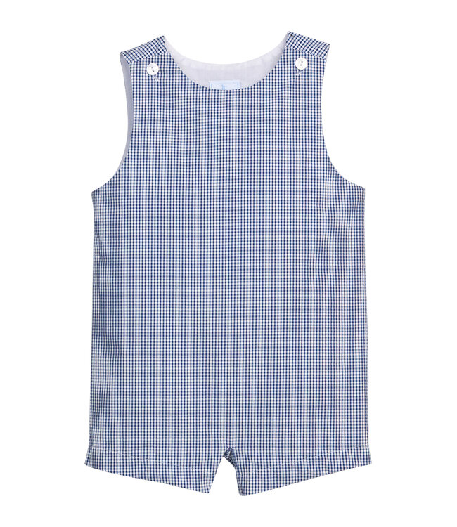 A traditional Little English silhouette with a vintage, slanted cut at the legs. Classic and versatile, this deep Royal Seersucker Gingham John John is an easy addition to your little boy's wardrobe. Add a monogram to complete the look!