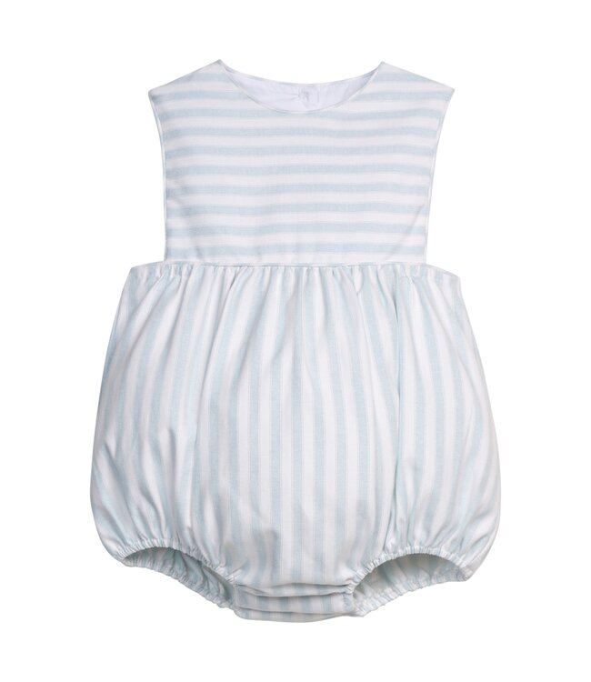 Little English's Apron Bubble is a sleeveless silhouette for baby with wide cut sides for easy movement and subtle gathers at the waist. Soft blue and white stripes add detail, making it an easy choice for vacations, beach family photos, or summer outings