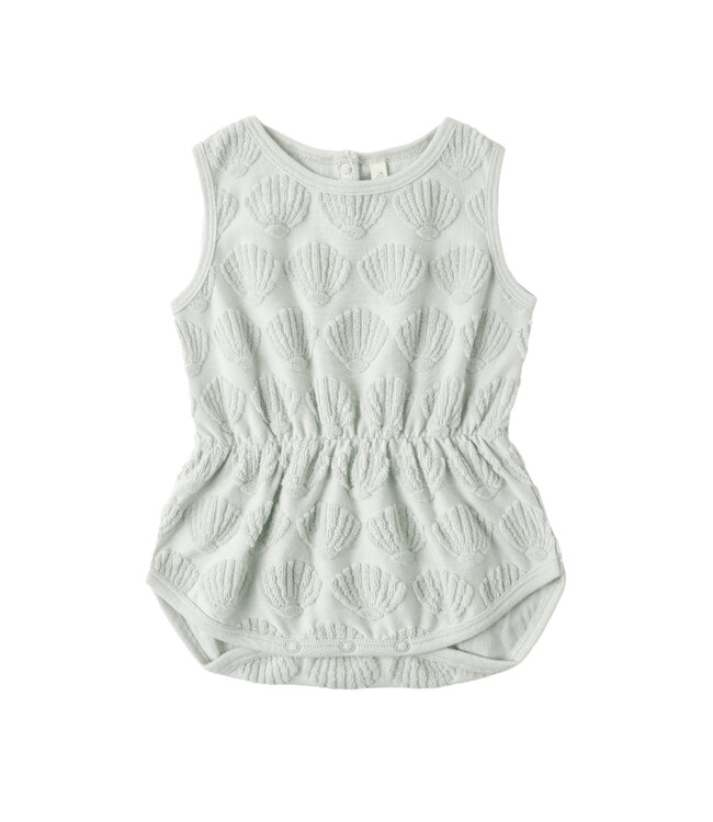 A summer classic, this sleeveless playsuit features a cinched waist and bottom snaps for easy changes. Featuring a 'seashells' print on Rylee + Cru's 'seafoam' hue.