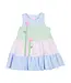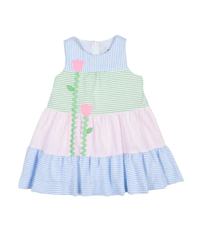 Light and joyful, this dress is crafted from pastel pink, blue, and green stripe seersucker for a breezy, warm-weather feel. Appliqué tulips bloom across the bodice with green ric rac stems, adding playful color and charming detail.