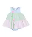 Fresh and playful Florence Eiseman baby girl romper in pastel pink, blue, and green stripe seersucker. Features appliqué tulips with green ric rac stems, shirred skirt tiers, elastic legs, and an invisible zipper—perfect for spring days.
