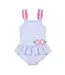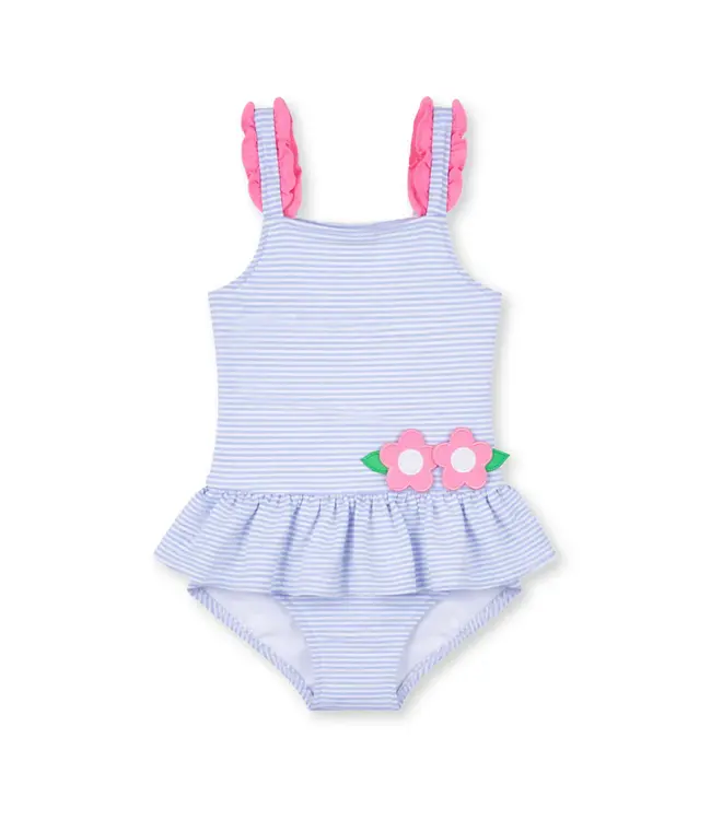 Sweet, sunny, and made for splashing, this Florence Eiseman skirted tank swimsuit is crafted from light blue and white stripe seersucker swim fabric with gentle stretch for a comfortable, secure fit. Bright appliqué flowers bloom across the front, while ruffled straps add playful charm.