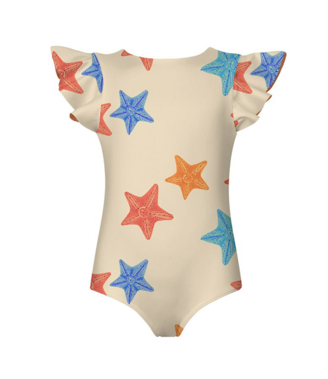 One-piece swimsuit made from soft stretch fabric. Features short flutter sleeves, a round neckline, and an open back with adjustable tie. Printed with multicolored starfish. Designed for comfort and freedom of movement. Quick-drying UPF 50+ fabric.