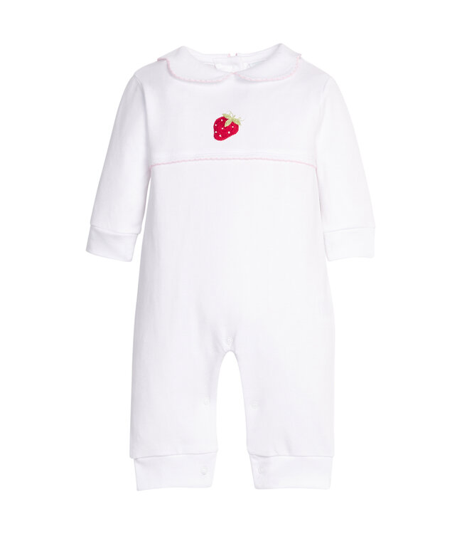 Little English's Crochet Playsuit is made from 100% Pima cotton with a hand-crocheted strawberry, light pink picot trim, and a scalloped peter pan collar. This white playsuit makes a great gift for Spring baby showers!