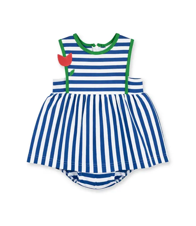 Bright and breezy for warm-weather days, this romper from Florence Eiseman is crafted from royal and white yarn-dyed stripe jersey knit with soft stretch for all-day comfort. A cheerful appliqué tulip with leafy details blooms at the front, finished with fresh green binding for a playful pop of color.