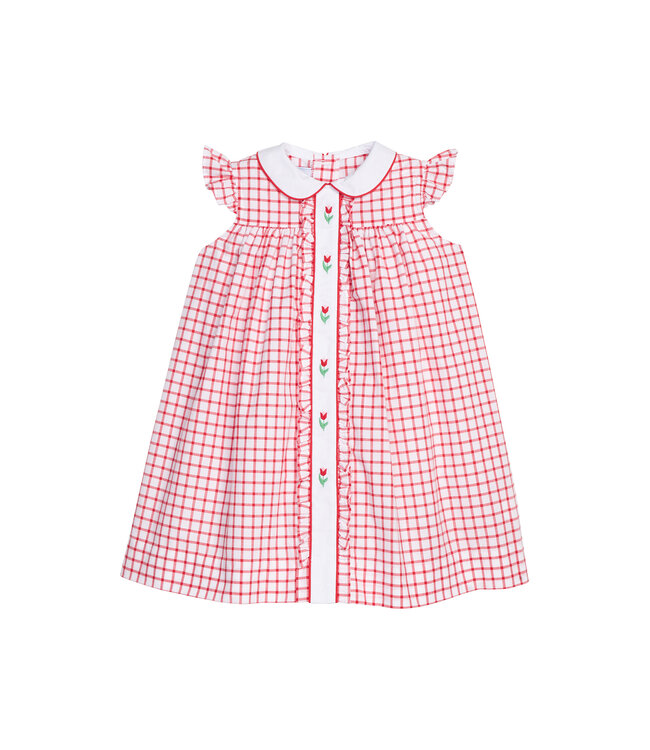 Little English's adorable Ruffled Sally Dress in Red Windowpane features a white peter pan collar with precious embroidered red and pink tulips down the center ruffled placket. Plus, coordinating sister styles are easy with other pieces in the Tulip Valley Collection! This versatile piece can be dressed up or down for your little girl to enjoy all season long.