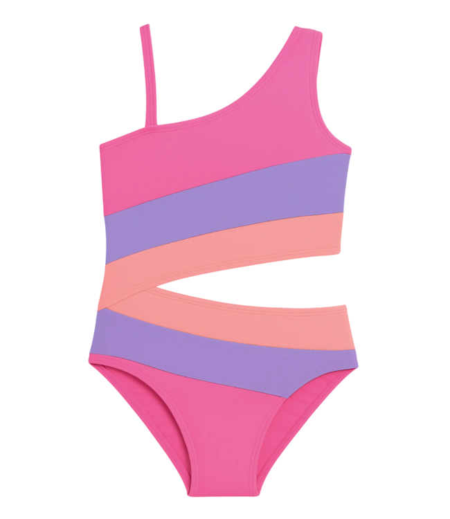 Limeapple's Vivi one-piece swimsuit showcases a vibrant colorblock pattern in hot pink, lavender, and peach, highlighted by a stylish side cutout, a single shoulder, and an adjustable strap for the perfect fit.