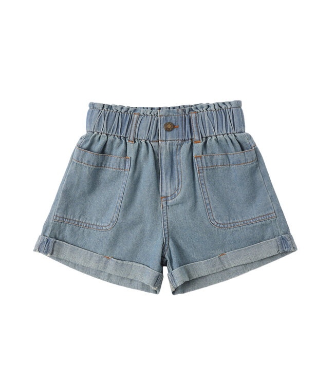 The Alba Short is the perfect summer staple. Featuring patch pockets in the front, cuffed hem and a gathered elastic waistband. These shorts are made for adventures all summer long! Featuring Rylee + Cru's 'washed blue' denim.