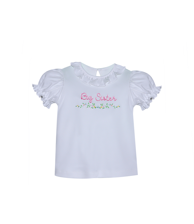 She will be dressed for the part in Remember Nguyen's adorable white knit top with hand stitched ‘Big Sister’ detail on the chest and ruffled collar and sleeve. The perfect top to announce a new little one or for big sister to meet her new baby.