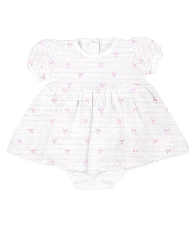 The LydaBaby White Bows & Stripes Dress is made from ultra-soft 100% Pima cotton and features a delicate pink bow print with subtle stripes. This timeless baby dress offers comfort, breathability, and effortless sweetness for everyday wear.