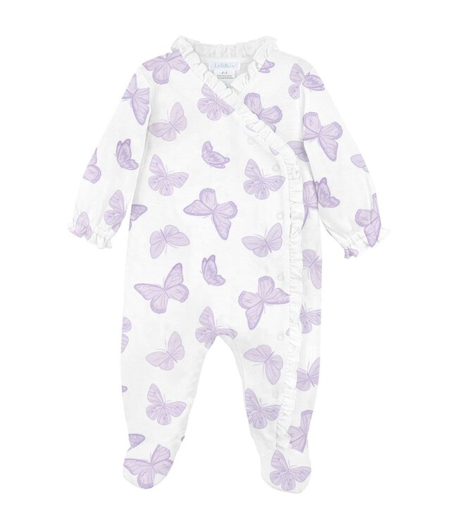 The LydaBaby White Butterflies Footie is crafted from ultra-soft 100% Pima cotton and features a delicate lavender butterfly print with ruffle trim. Designed for comfort and elegance, this footie is perfect for everyday wear and sweet dreams.