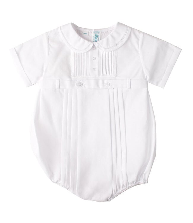 This baby boy creeper features a sweet peter pan collar with fagoting trim, and a bodice covered in hand stitched pintucks with dainty little buttons ending in a tiny row of lace beading. A tuxedo style waist band separates the bodice from sharp pleats.