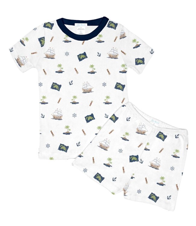 The LydaBaby White Pirate’s Island 2-Piece PJ Set is made from ultra-soft 100% Pima cotton and features a charming nautical print with ships, anchors, and islands. Designed for comfort and classic style, it’s perfect for cozy nights and bedtime routines.