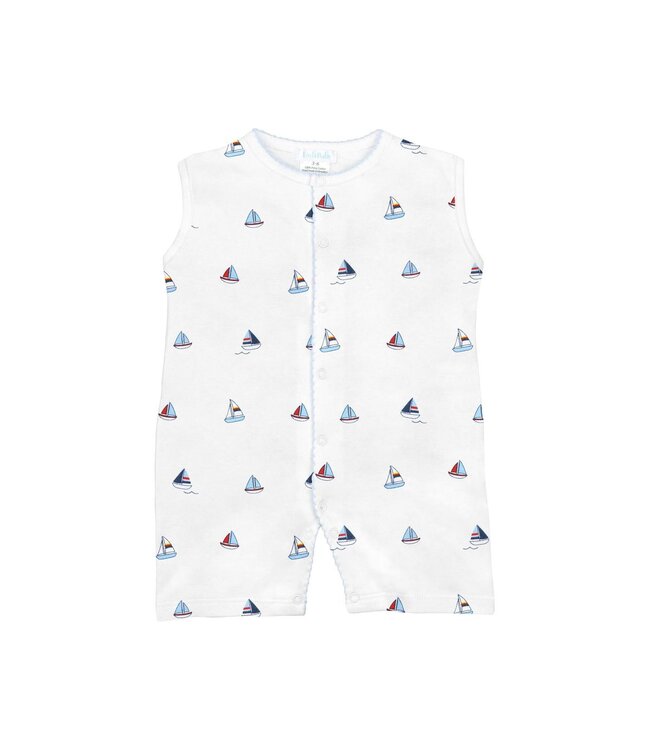 The LydaBaby White Small Sailboats Romper is crafted from ultra-soft 100% Pima cotton and features a classic sailboat print with easy snap closures. A timeless, breathable romper perfect for warm days and everyday baby comfort.